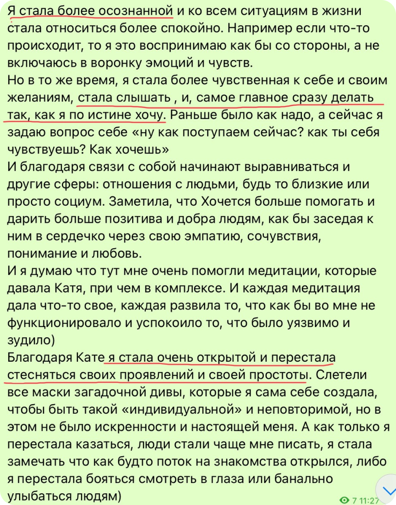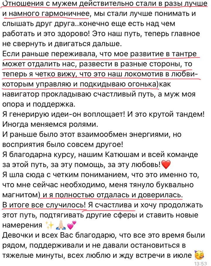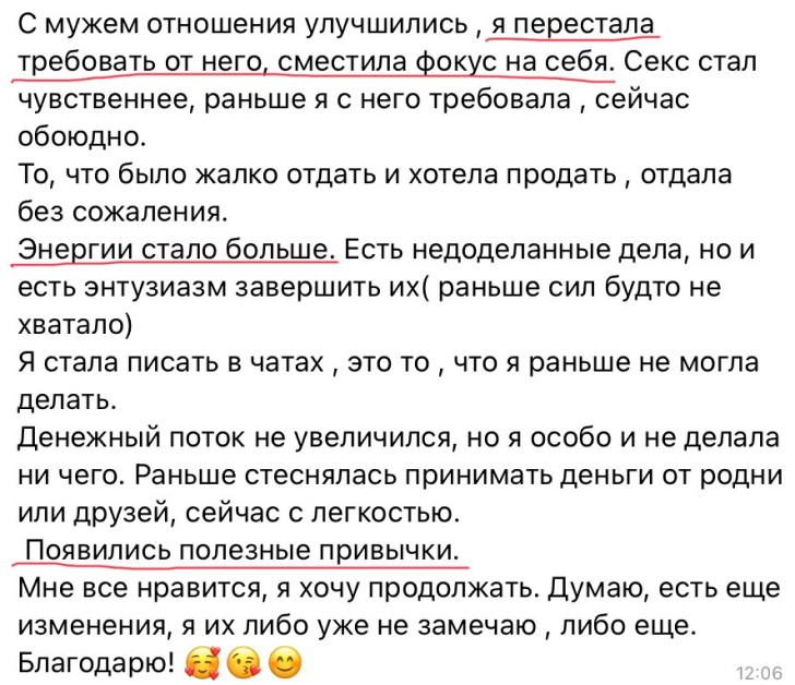 Значительно легче приходят деньги, отношения с мужем стали крепче, поняла что я ЗА мужем, жизнь стала насыщеннее, энергии теперь хватает на абсолютно все, любовь к себе и забота теперь у меня на первом месте.