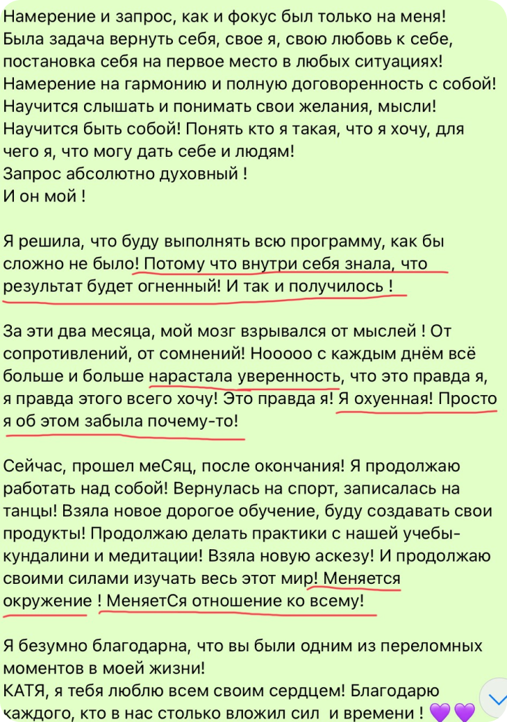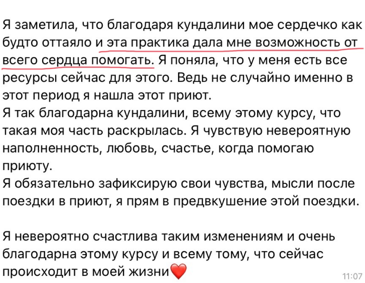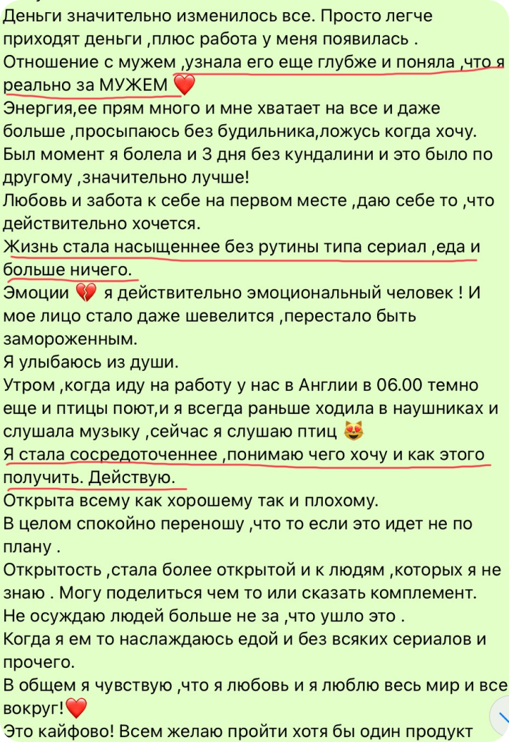 Кундалини повысила сексуальную женскую энергию, которая притянула очень много изобилия в жизнь. Теперь я живу в реализации, любви, радости, благодарности.
